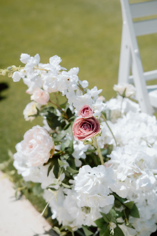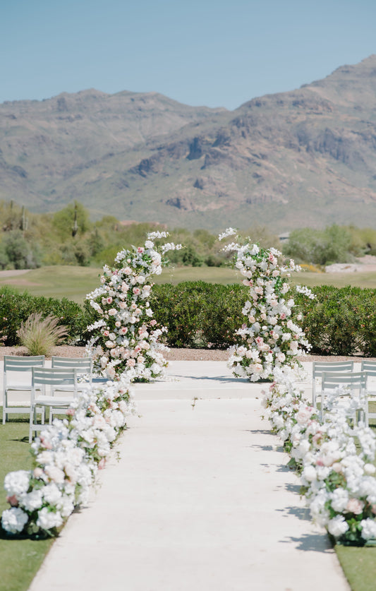 There is peace in knowing exactly what your flowers will look like. Our floral pillars and aisle flowers are made of luxury hand-painted florals that are always in-season and will not wilt in the sun...